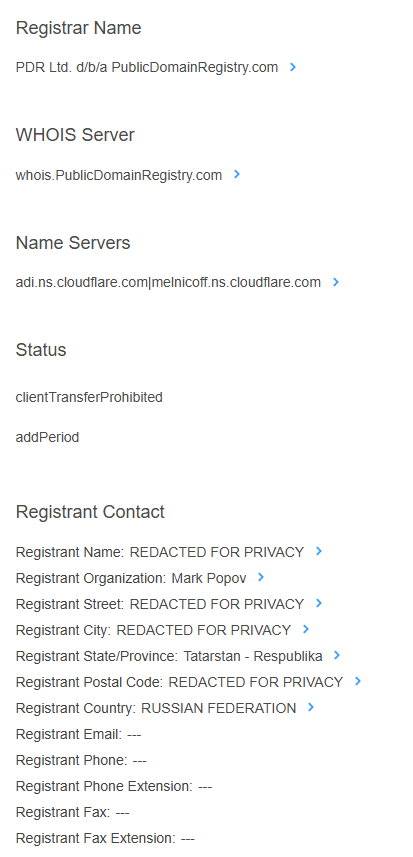 To illustrate, let’s take a look at ferromny[.]digital, one of the domains identified by CISA as deploying LummaC2 malware. WHOIS history tells us that the domain was registered on March 24, 2025, by a registrant organization named Mark Popov, with PDR Ltd. as the registrar.