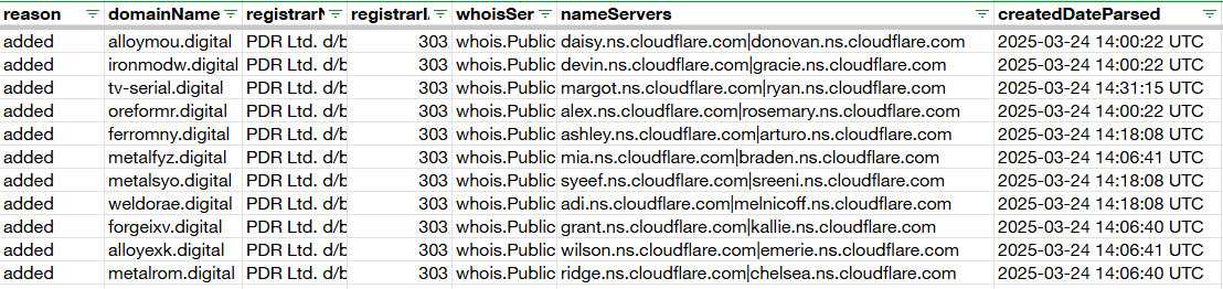 Going back to the LummaC2 IoC example, ferromny[.]digital, predictive threat intelligence at the time of its registration actually picked up other domains that had similar characteristics — the same registrar, Cloudflare nameservers, the same registrant country, and even the same registration date and time (with only a few seconds’ difference between each registration). Two of those we’ve already seen when using Reverse WHOIS in our previous attribution mini exercise.