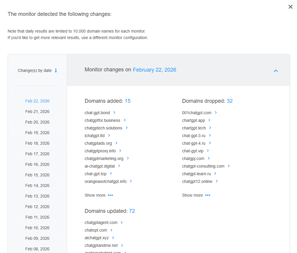 - Brand monitoring: Use brand monitoring tools that scan for new domain registrations containing your brand name and trademarks and alert you immediately when a lookalike domain is registered.